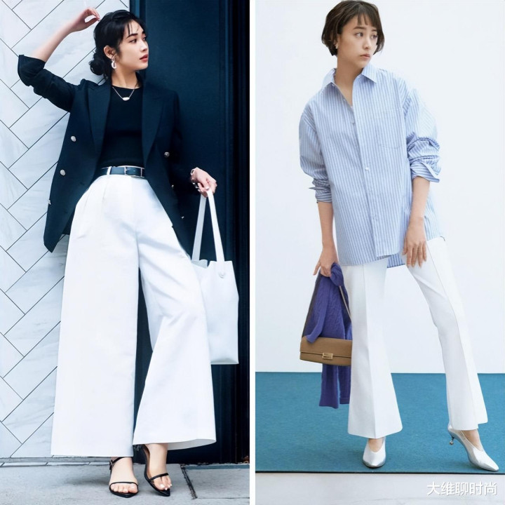 经典条纹衬衫配白色裤子,立刻营造夏日氛围。选择修饰腿型的喇叭裤更显时尚感,包包和鞋子用成熟色系搭配,整体造型更加精致有型。